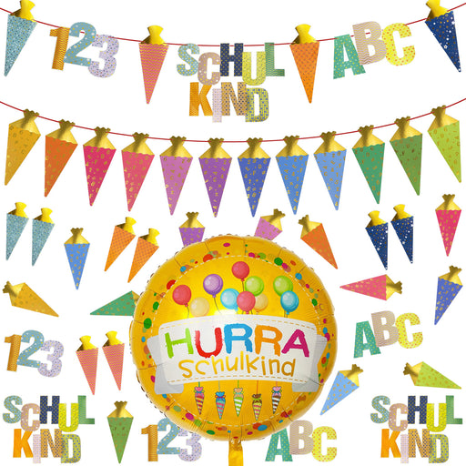 Dieses umfangreiche Schuleinführung Deko Set beinhaltet eine wunderschöne Girlande mit bunter Aufschrift: "ALLES GUTE ZUM SCHULANFANG" und 5 niedli...