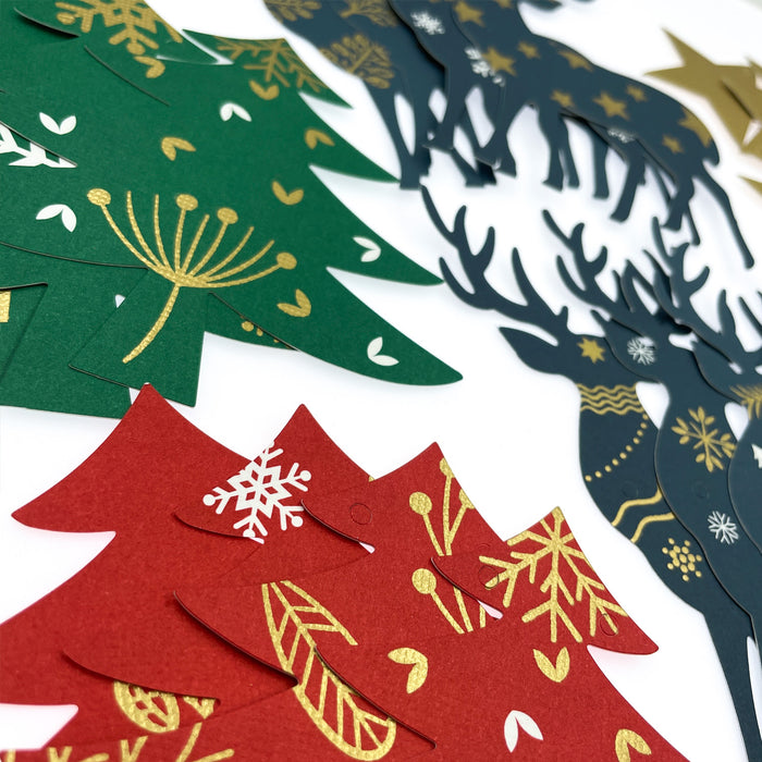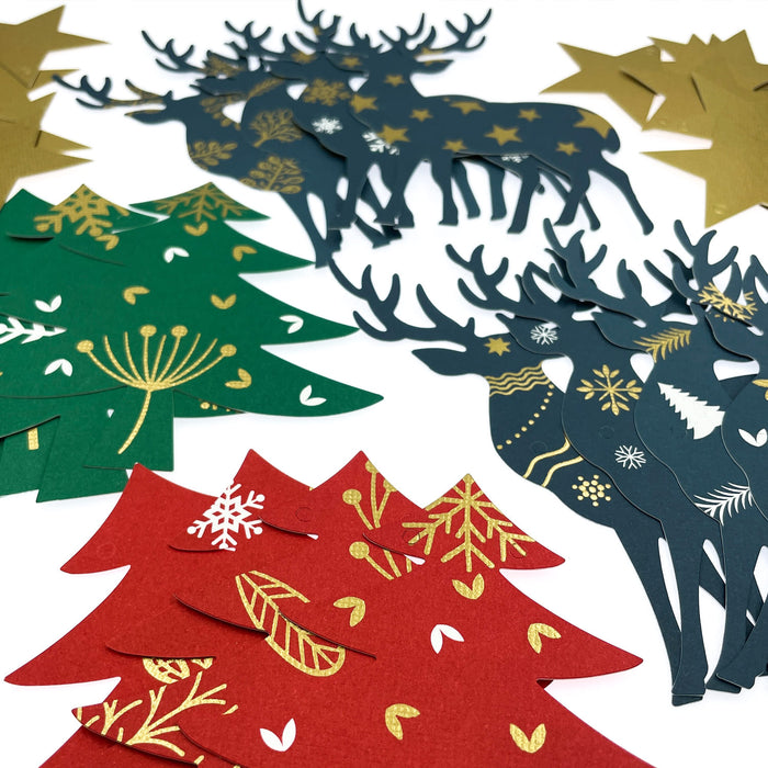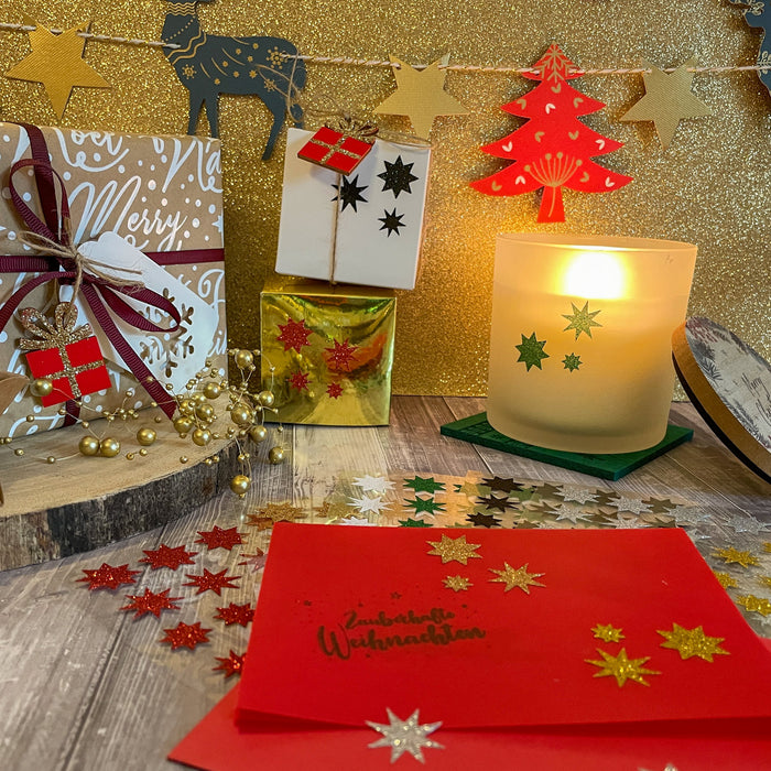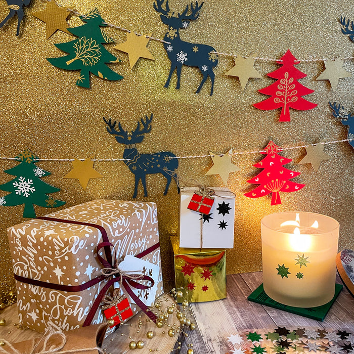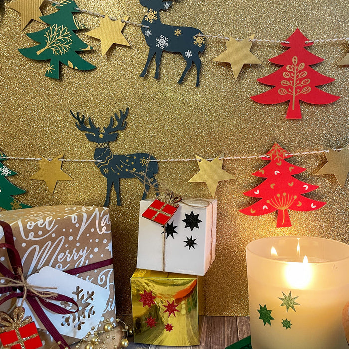 Die harmonische Farbkombination dieser Girlande verleiht jedem Raum eine elegante, winterliche Atmosphäre. Die liebevoll gestalteten Elemente – goldene Sterne, blaue Hirsche sowie rote und grüne Tannenbäume – sorgen für ein einzigartiges weihnachtliches Ambiente.