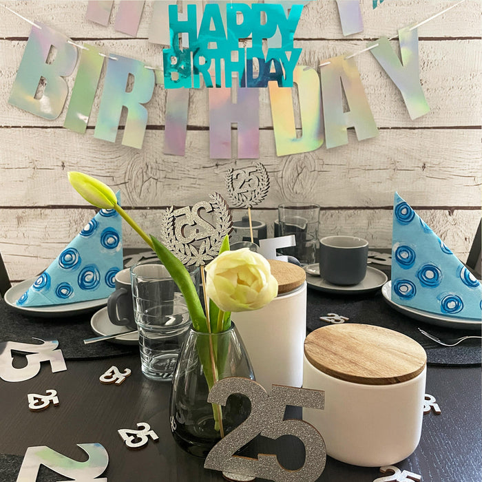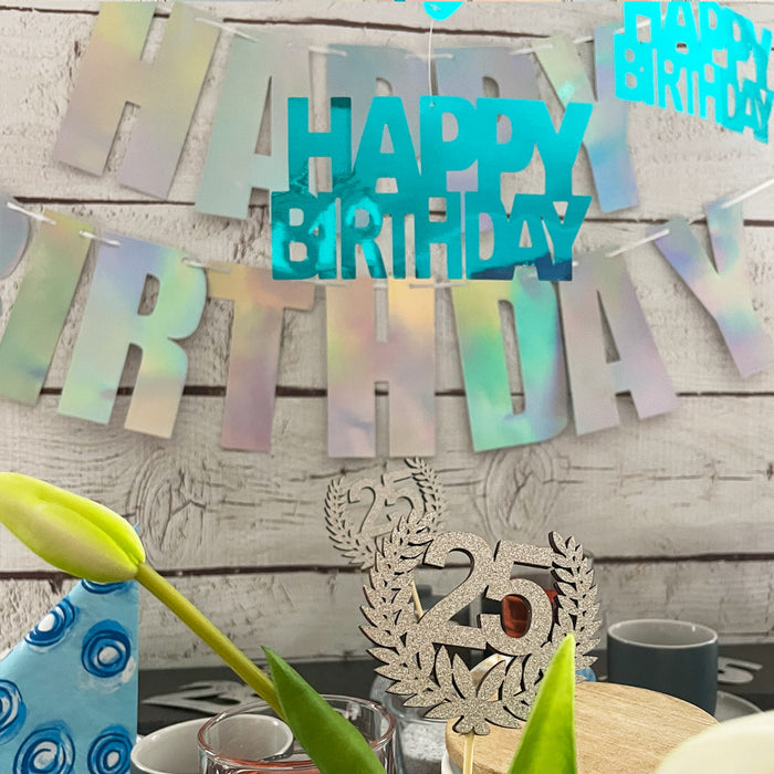 Diese wunderschöne und elegante Girlande besteht aus dem silber irisierenden Schriftzug Happy Birthday. Der Schriftzug erzeugt einen tollen Lichteffekt und ein schönes Ambiente. Diese Happy Birthday Girlande ist die ideale Deko zum Geburtstag bzw. zum Kindergeburtstag und ein richtiger Blickfang für Ihre Geburtstagsparty.